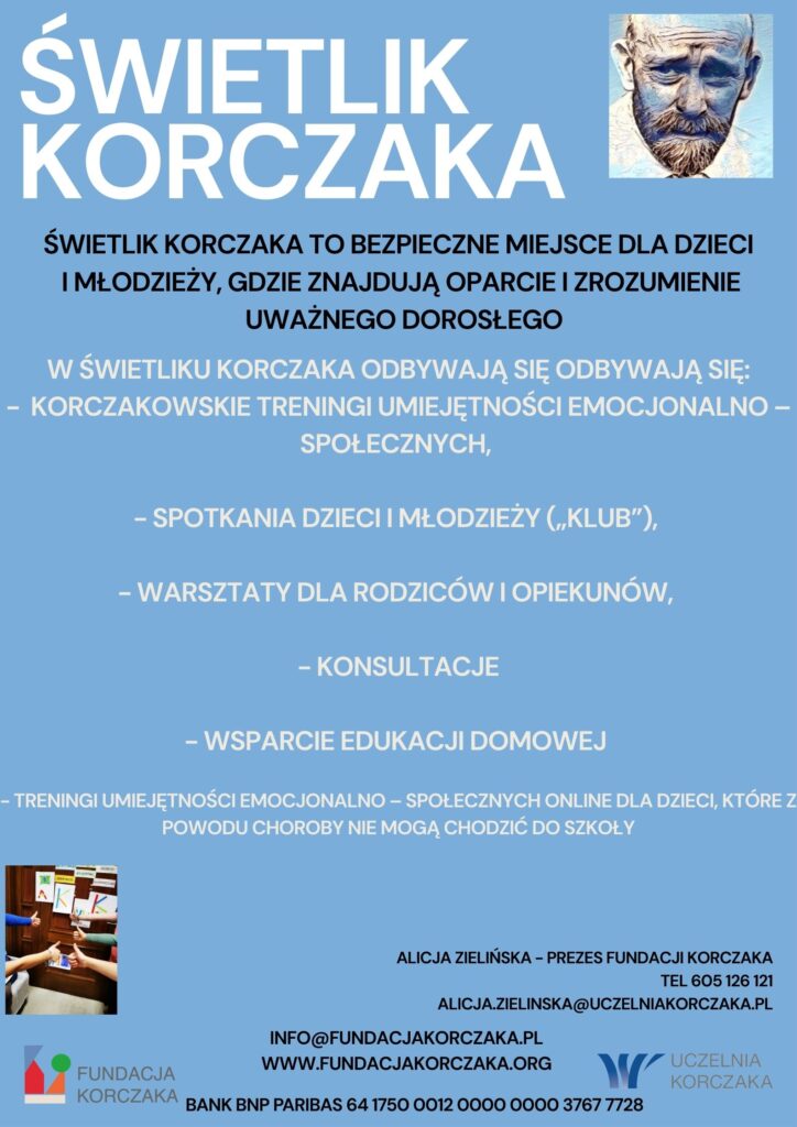 Uruchomiliśmy z Uczelnią Korczaka studia podyplomowe dla osób, które chciałby pogłębić swoją wiedzę i umiejętności w zakresie kompetencji specjalisty ds. wsparcia dzieci, młodzieży i dorosłych oraz terapeuty środowiskowego oraz uzyskać kwalifikacje terapeuty środowiskowego, mediatora, osoby prowadzącej trening umiejętności emocjonalno – społecznych, wspierającej osoby z kryzysem migracyjnym i inne.